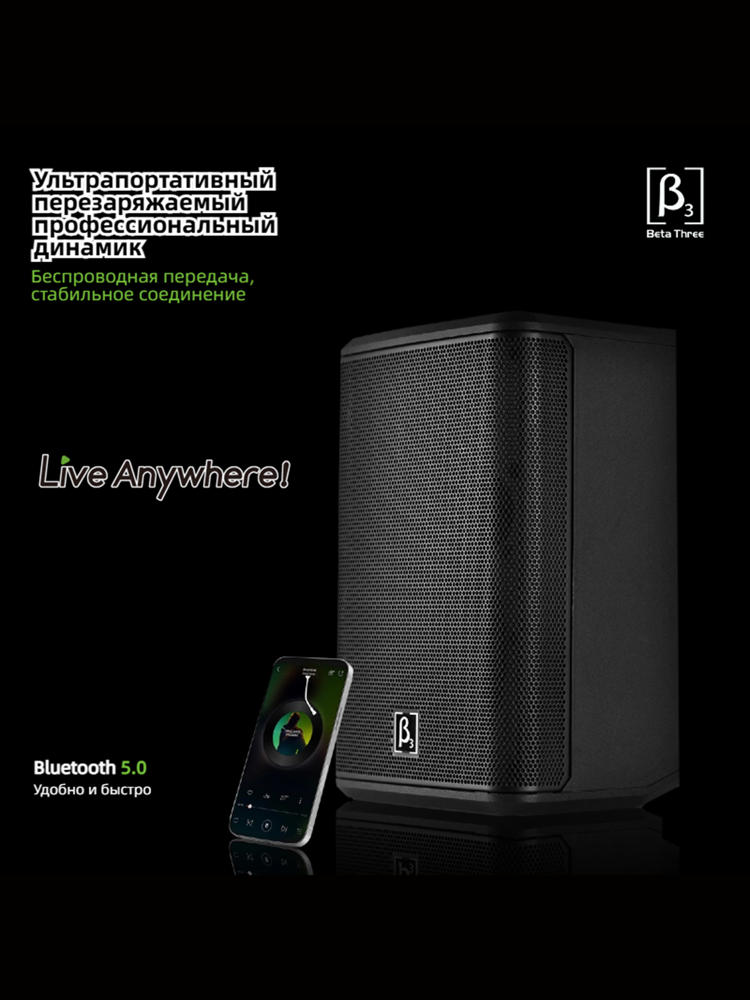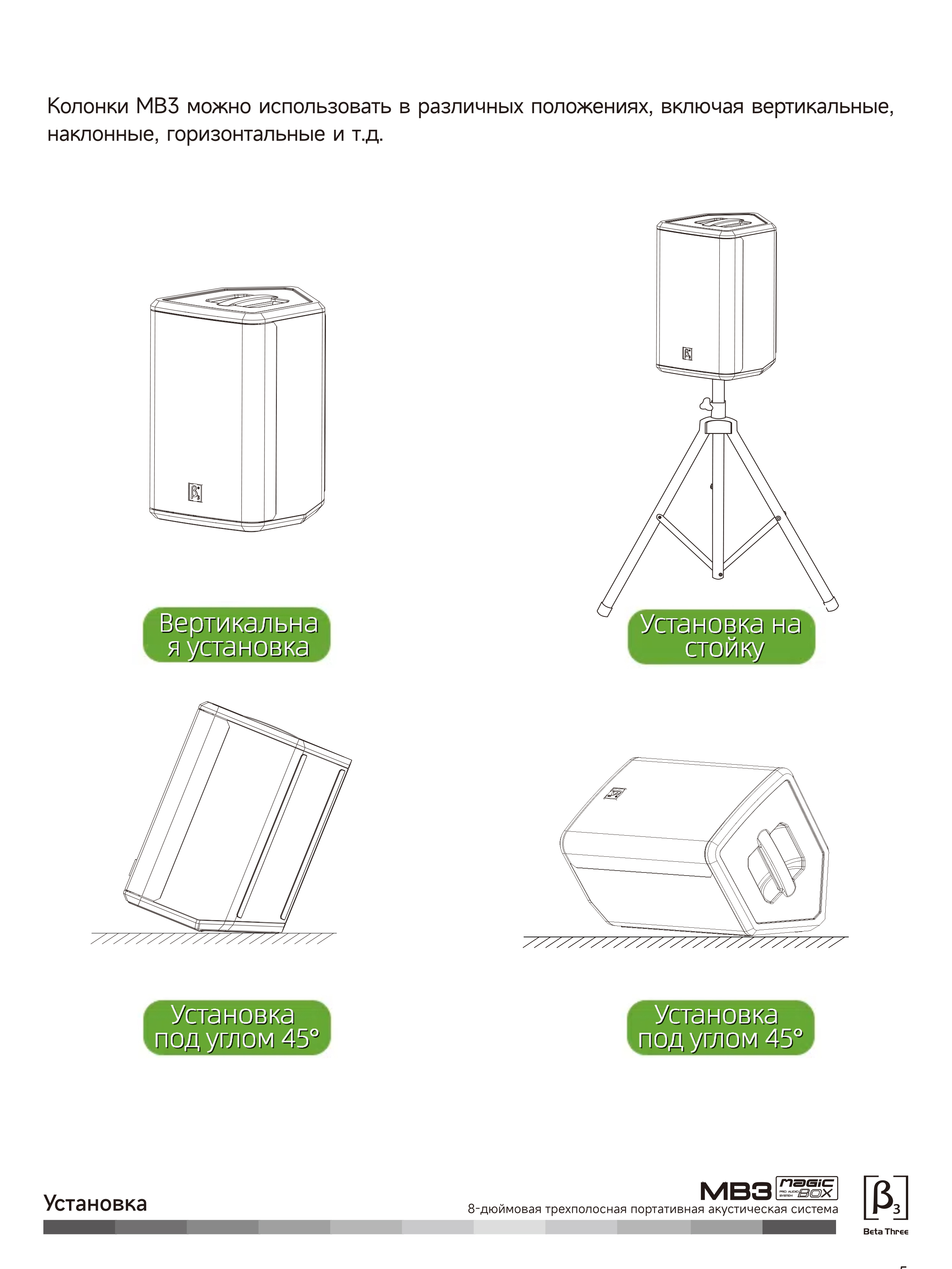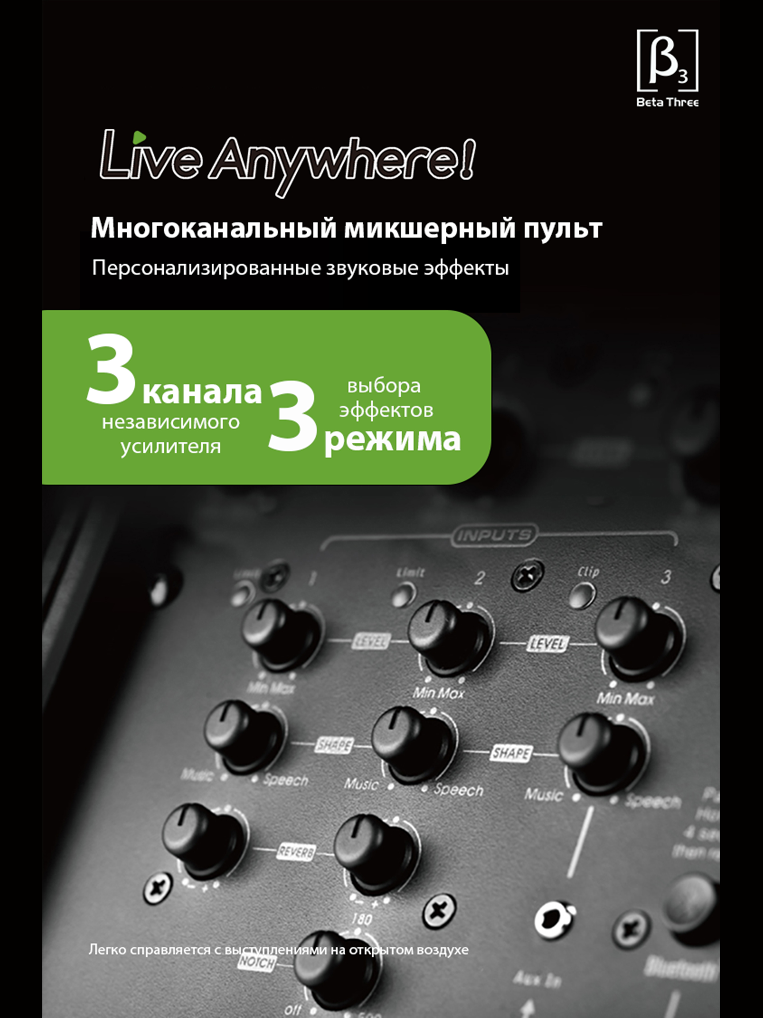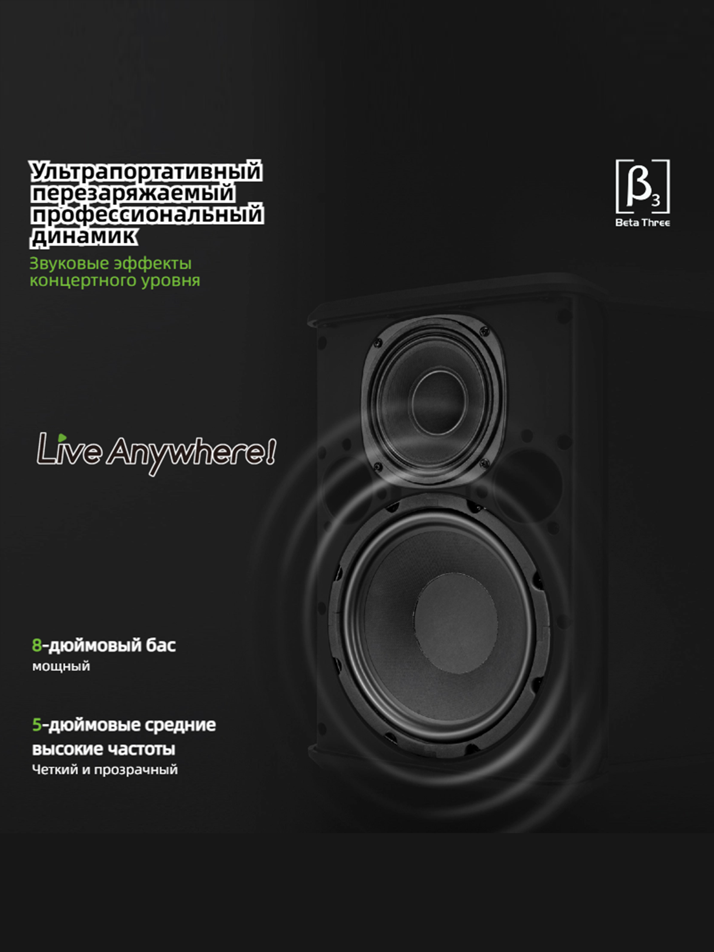 Mb3 - этo легкаЯ 8-дюймоваЯ трехполоснаЯ портативнаЯ колонка. напредставлЯет собой идеальное решение длЯ Живых выступлений и работы дидЖеевPабота при высокой мошности составлЯет около 5,5 Часов, аккумулЯтор мв доказываетЧTO BЫ MоЖете брать сво музыку куда угодно.C 8-дймовым вуфером и коаксиальныMсреднеЧастотным драйвером/твитером MвЗ ЯвлЯетсЯ настоЯшей З-полоснойакустиЧеской системой, где большинство компактных динамиков с питанием отбатареи такого размера ЯвлЯтсЯ 2-полосными моделЯми. -полоснаЯконструкциЯ обеспеЧивает максимальный бас и сверхЧеткость, а многоугольнаЯгeометриЯ обеспеЧивает гибкость в использовании в лбых условиЯх: будь топлЯЖ, спортивнаЯ плошадка, тренаЖерный зал или тротуар, MвЗ создан длЯпроведениЯ необыЧных концертов в необыЧных местах, обеспеЧиваЯ при этоMнаилyЧшее звуЧаниe.